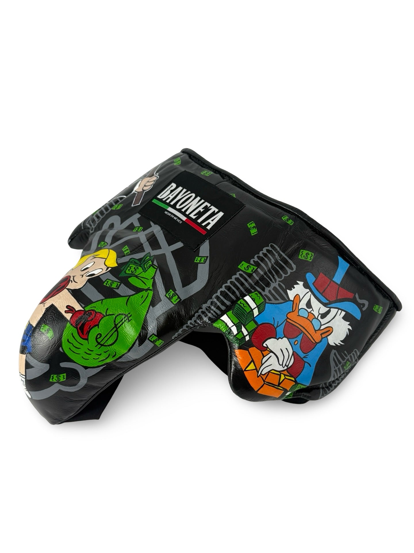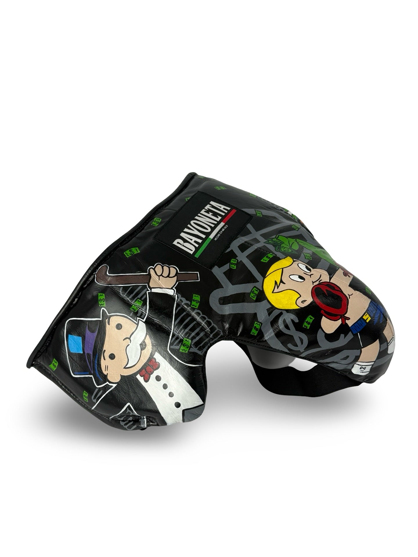 The Bayoneta Groin Guard is a luxurious, hand-painted piece inspired by "Monopoly Land”. Crafted in elegant white, this exclusive custom guard blends traditional motifs with refined artistry, offering superior protection with a sophisticated cultural statement. Perfect for those who value both performance and heritage in their gear.